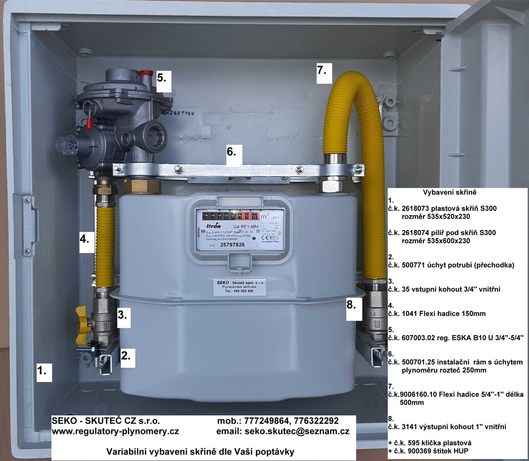 Na plynoměry a regulátory tlaku plynu dodáváme rovněž plastové skříňky a dvířka Seifel, Claved, Mitras, které vynikají pevností materiálu, odolností proti UV záření, dlouhou životností a jsou nehořlavé.